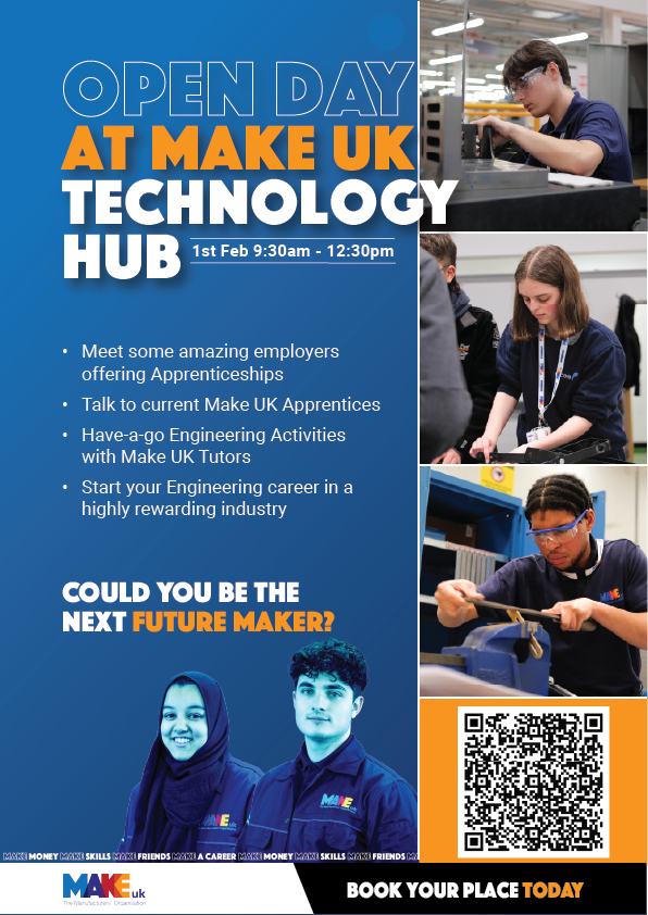 Explore engineering and manufacturing apprenticeships at our Open Day on February 1st at Make UK Technology Hub in Aston, from 9:30 to 12. Engage with potential employers, tour our incredible technical training centre, and meet tutors shaping essential skills in these fields. Connect with fellow apprentices, exploring the possibilities of becoming one in the dynamic realms of engineering and manufacturing.