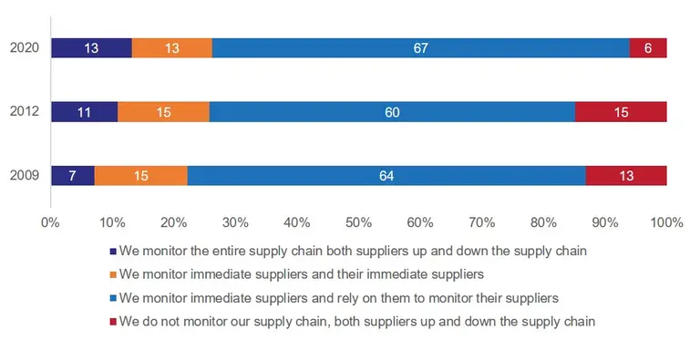 Despite the numerous geopolitical events since 2009, little has changed since we asked the same questions in 2009 and in 2012. However on a positive note, the data shows manufacturers are moving in the right direction as we saw the number of manufacturers monitoring their supply chain double from 7% to 13% between 2009 and 2020 whilst the number not proactively monitoring their supply chain has more than halved since 2009, moving from 13% to 6% . There clearly has been progress however that still remains a small proportion of manufacturers who have the visibility they need to begin to mitigate the impact of shocks to their supply chains. It is evidently clear, the visibility gap for manufacturers remains.
