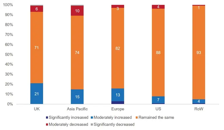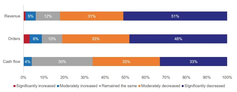 Unsurprisingly our survey found that the greatest impact of Covid-19 on manufacturers was felt on revenues - over half (51%) reported a significant decrease, and a further 31% reporting a moderate decrease. It was a similar picture for orders too, with 48% seeing a significant decrease, and 33% seeing a moderate decrease. These results are unsurprising given demand fell dramatically as lockdowns were imposed and supply chains came to halt.