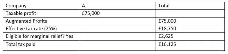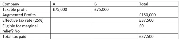 Two manufacturing SMEs, company A and B are associated companies. Since company A is associated with company B, the upper limit at which the 25% tax rate begins (without marginal relief) decreases from £250,000 to £125,000. In this scenario both companies are assumed to make the exact same profit, there the total augmented profits are at £150,000 (£75,000 each). For the purposes of these examples the impact of dividends is not included and will not consider the impact of more than 1 association. However, for 2 or more associations the examples below will apply similarly.