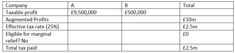 In that situation (Table 2) where both companies are ‘un-associated’, company A would have a tax liability of £18,750 (and be eligible for £2,625 marginal relief) resulting in an effective tax rate of 21.5%. The same would be true for company B, together the total tax paid by both these companies would be £32,250 (£5,250 less than in the situation where these businesses are associated).