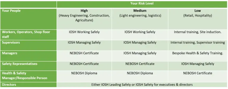 But competency goes further than just risk assessment, in fact the need to make someone competent may well be a control measure that comes out of your assessment. So, let’s refer to the HSE again. The HSE also provide guidance on what training different levels of employees require (Directors, Managers, Supervisors, Workers & Contractors) they suggest: