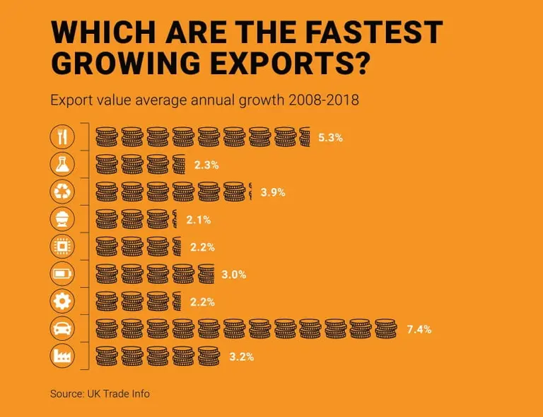 The transport sector also led the way in export growth increasing by 7.4%, largely on the back of continued growth in aerospace, closely followed by food and drink which increased exports by 5.3%.